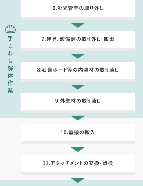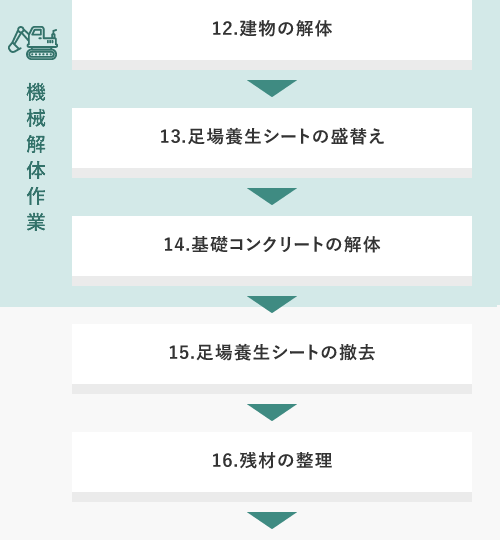 建物解体においては多くの廃材が発生しますが、その中には再資源化できる部材も多く含まれます。当社では、解体において屋根材・内装材(建具・石膏ボード・畳・照明器具等)の先行撤去を行い、そのうえで建物解体(木くず、鉄骨、構造材等)と基礎解体(コンクリート等)の分別を実施、リサイクル率の向上を高める解体を実現しています。